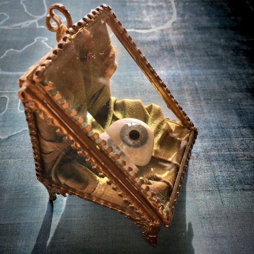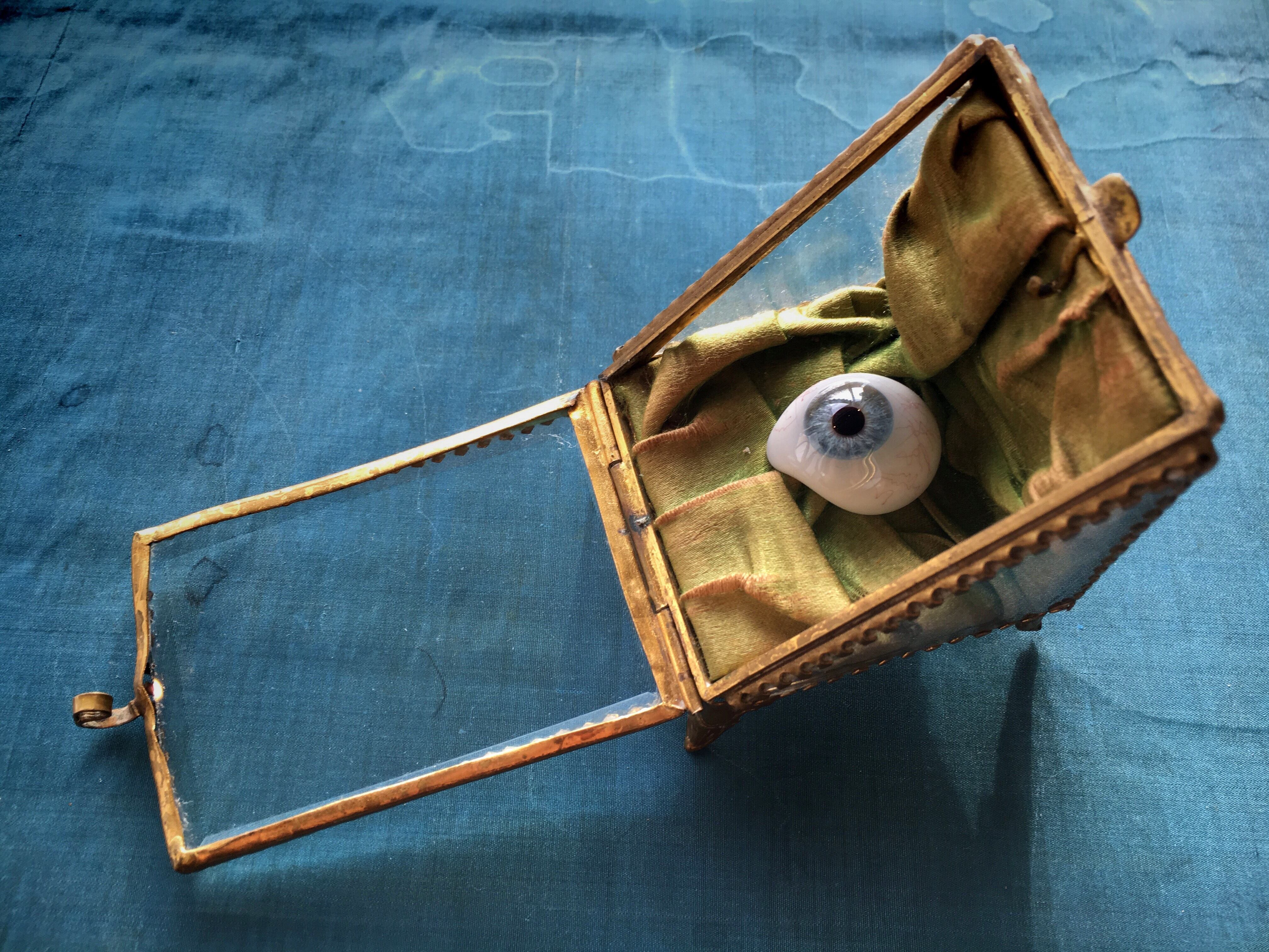 義眼を飾るのにピッタリのジュエリーケース。モスグリーンのベルベット張りで重厚です。中にフックが付いているので元々は懐中時計ケースだと思いますが、鉱物の原石を飾るのにもいいと思います。1900年頃イギリス製、サイズは高さ約7.5センチ、奥行きは外寸で約5.5センチ、古いものですので布と全体に変色や擦れ、キズなどがあります。