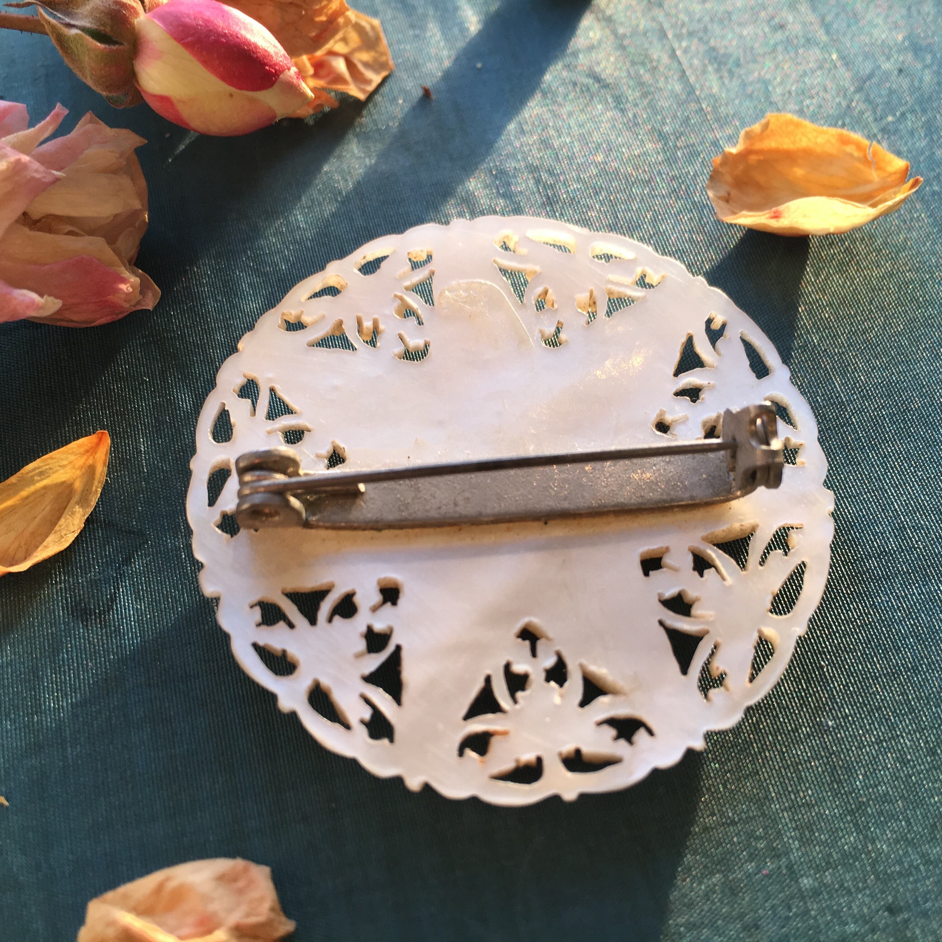 ベツレヘム製の真珠貝を手彫りしたブローチです。真珠貝特有のしっとりと濡れたような輝きがあり、清らかで繊細な印象です。角度によって虹色に輝いて見えます。外側が紺色で内側が黒いベルベット張りのケース付き。オリジナルのケースではありませんが、入れてみたらたまたまサイズがピッタリでした。このケースはイギリスの古いものです。プレゼントにもいかがでしょう。ケースのサイズ約7㎝×7㎝×2㎝、ブローチの直径は約3.5㎝です。