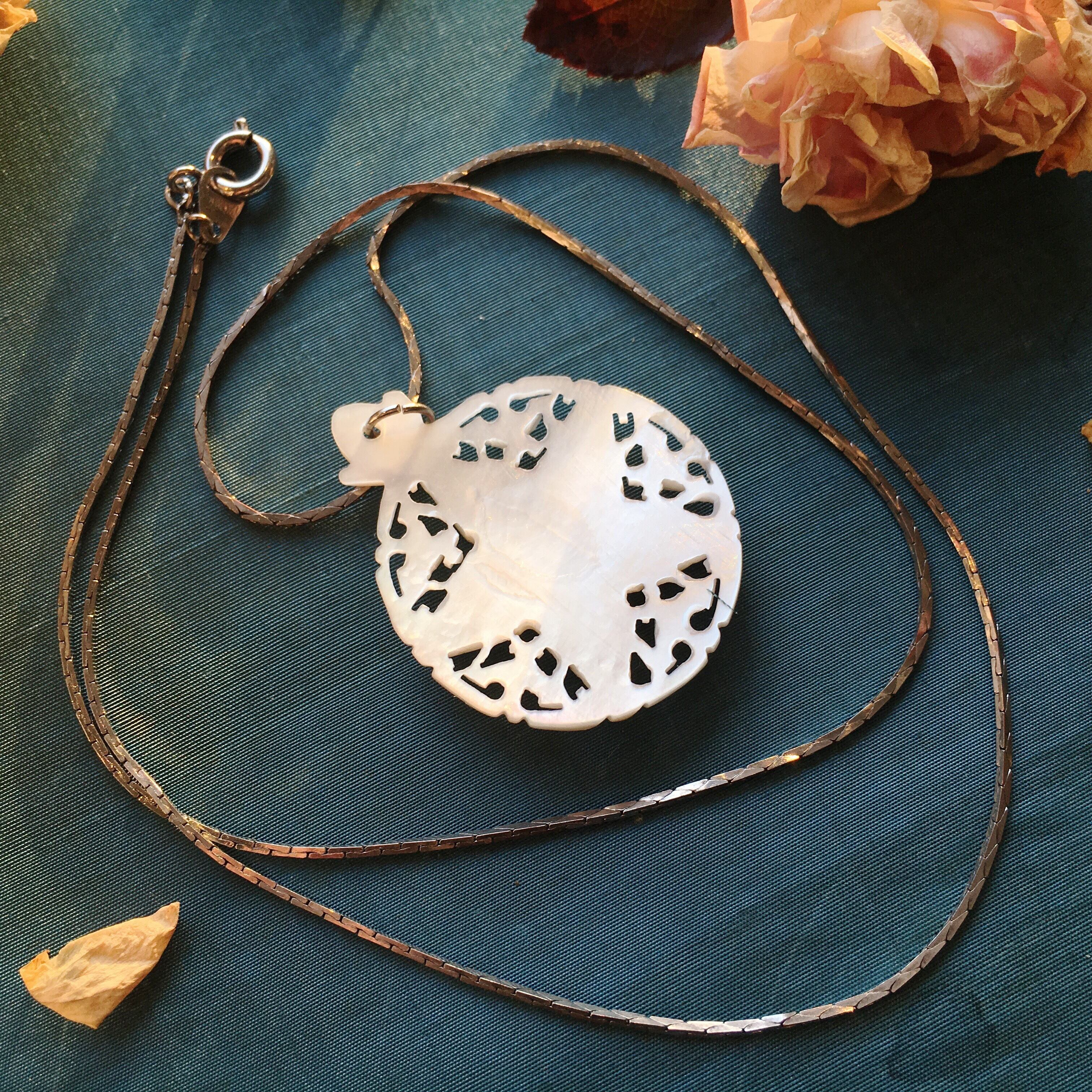 ベツレヘムで真珠貝を手彫りしたペンダントです。製作から60年程度は経ったヴィンテージのお品で、うっすらと程よい飴色になっております。真珠貝特有のしっとりと濡れたような輝きがあり、清らかで繊細な印象です。