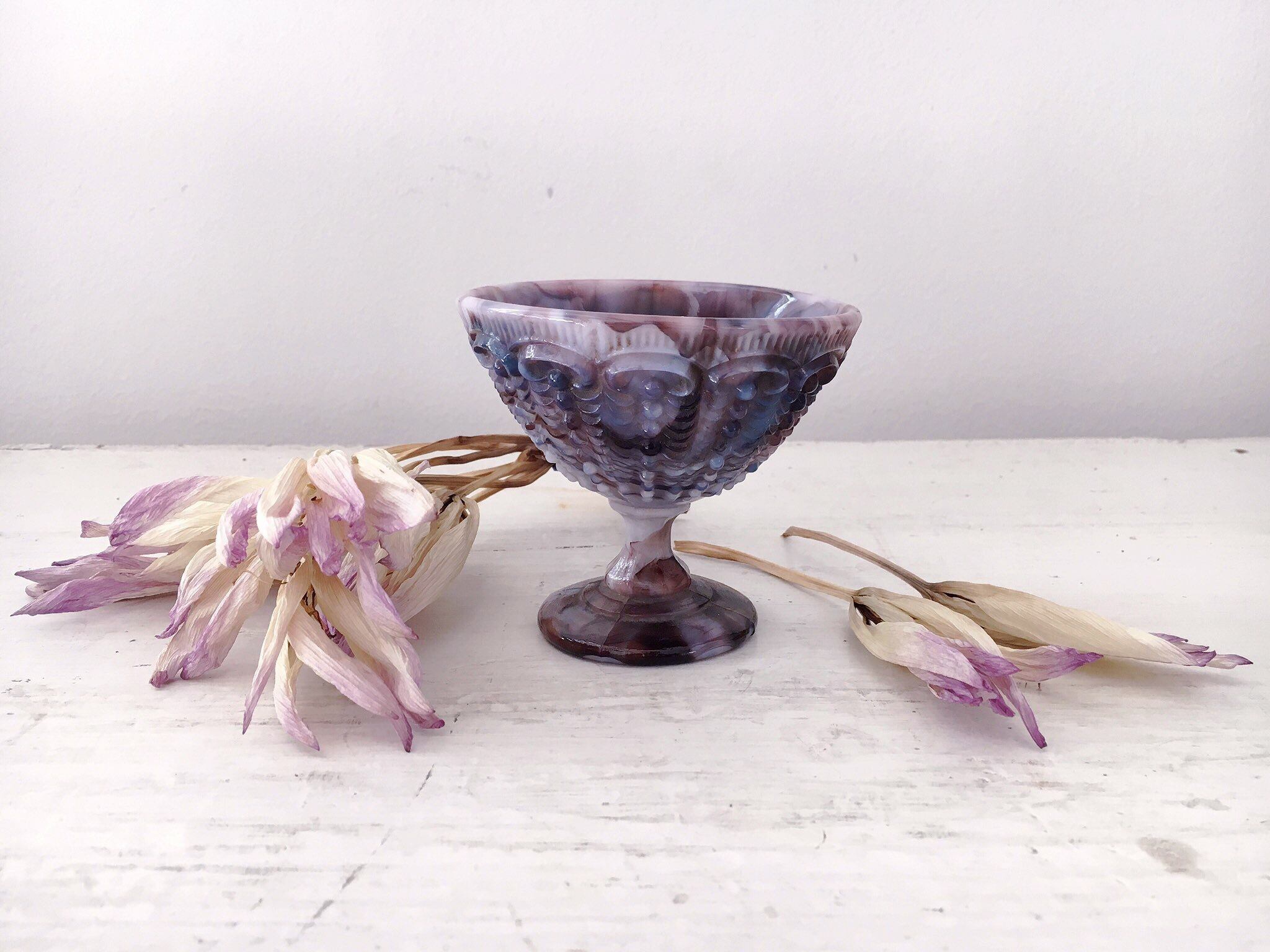 19世紀イギリスで、溶かしたガラスを型に流し込む手法が確立され、このガラス器が生まれました。その製法から、同じマーブル模様はふたつとありません。サイズは、口径が約8センチ、高さが約7.5センチです。