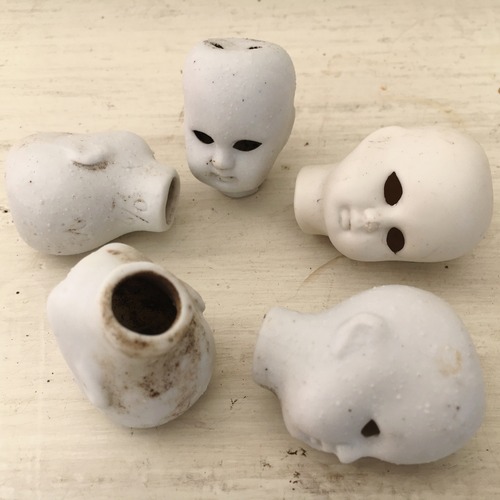 ドイツの人形工場跡地から掘り出されたビスクドールヘッドです。かつては、産業廃棄物などという考えはなく、製造の途中で問題の生じた製品は、何でも埋めて処分していたようです。これらのヘッドは、彩色、加工前に埋められ、長い年月の後に掘り出されたものです。そのようなわけで、製作年ははっきりしませんが、100年近くは埋められていたのではないかと思われます。一度は忘れられたドールヘッドに、長い長い時間が授けた独特の表情をお手元に置いて、どうぞお楽しみください。