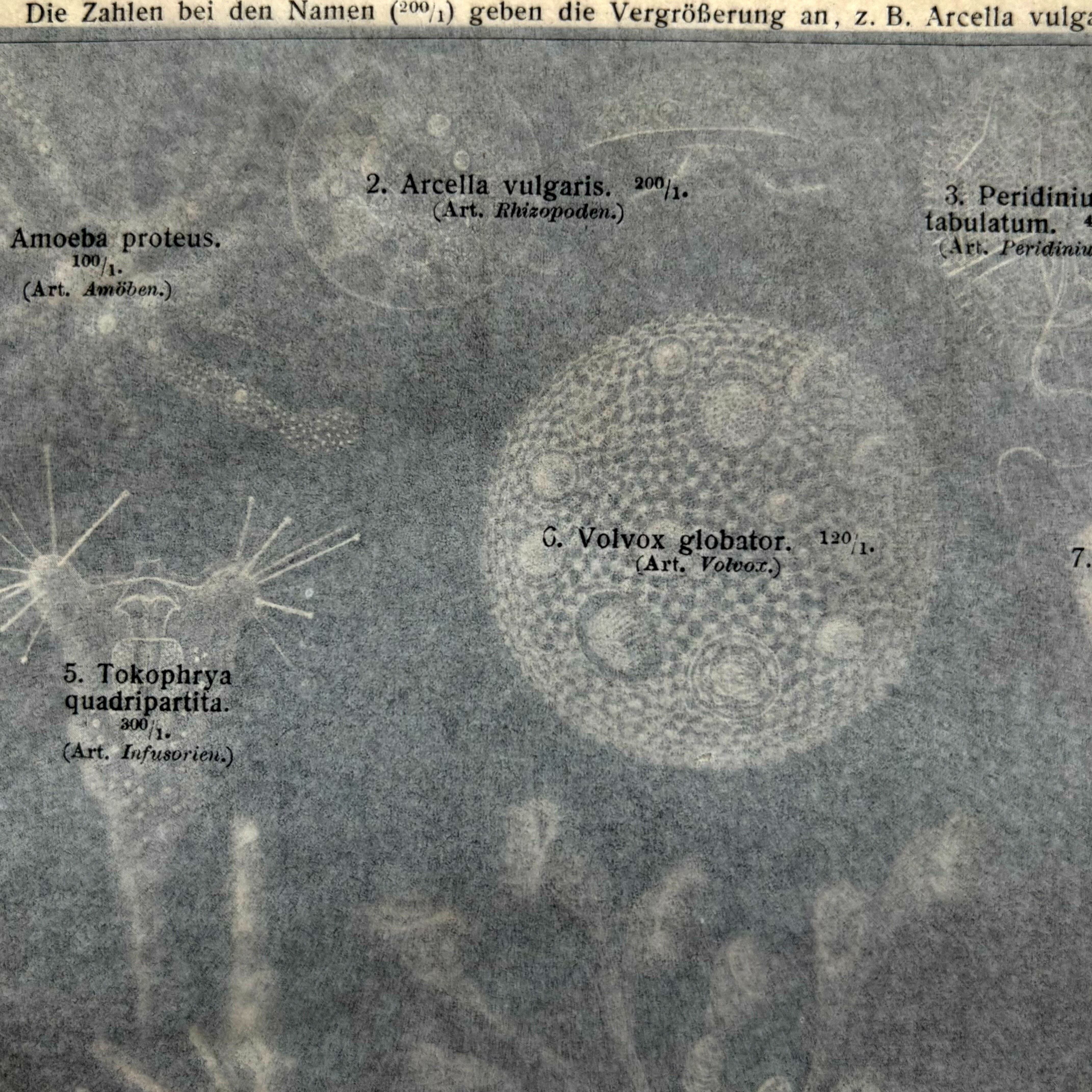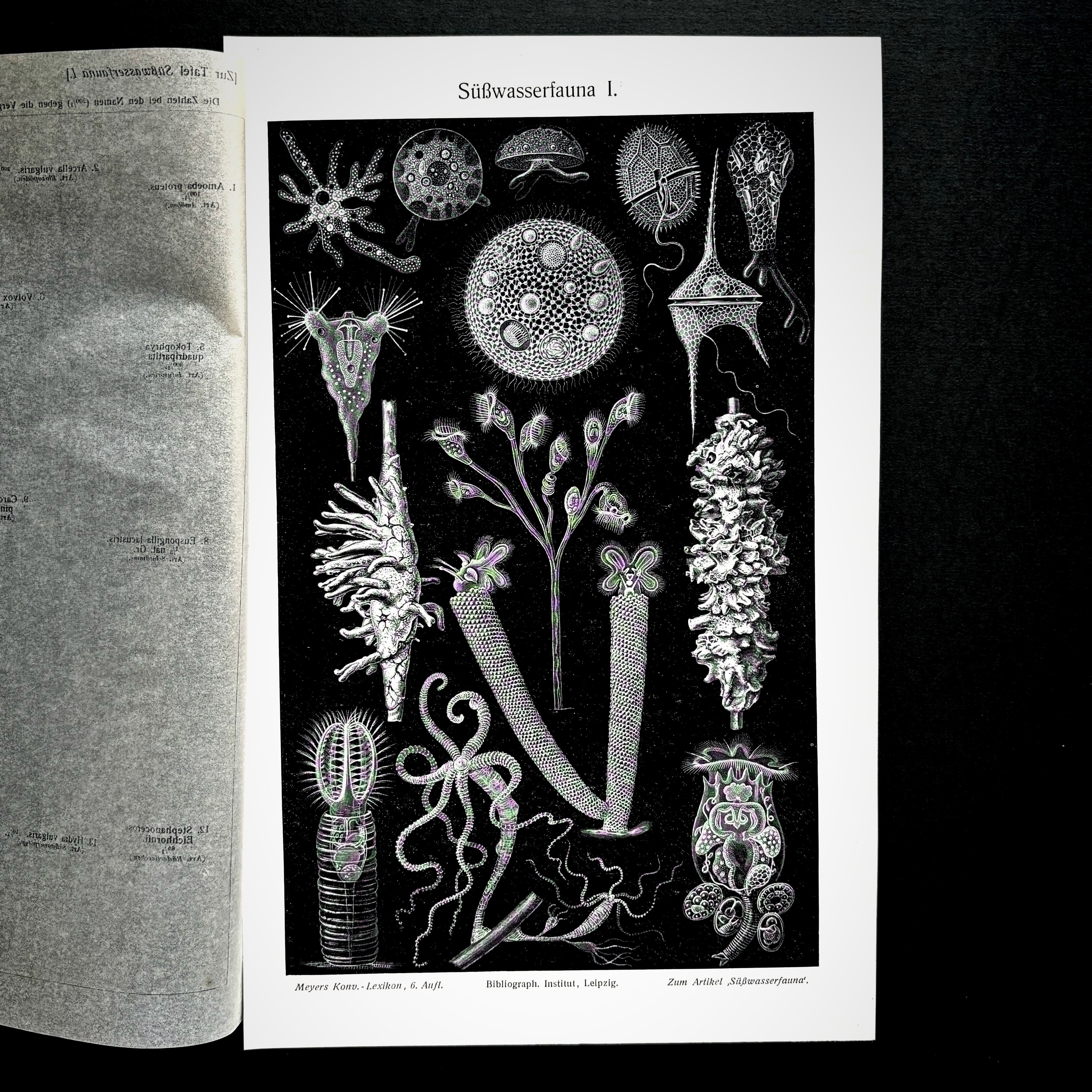 こちらはどちらかと言うと原始的な水生生物を紹介した博物画です。緑藻のボルボックス、海綿、大型のアメーバ、ヒドラなど、黒を背景に、どこか点描画を思わせるテイストで陰影をつけ、複雑な構造や立体感を見事に表現しています。あくまでも博物画ですから意図したものではないのでしょうが、漆黒の闇に浮かぶように描かれたその姿は、あまりにも幻想的で、実在の生物ではないような気さえしてきます。