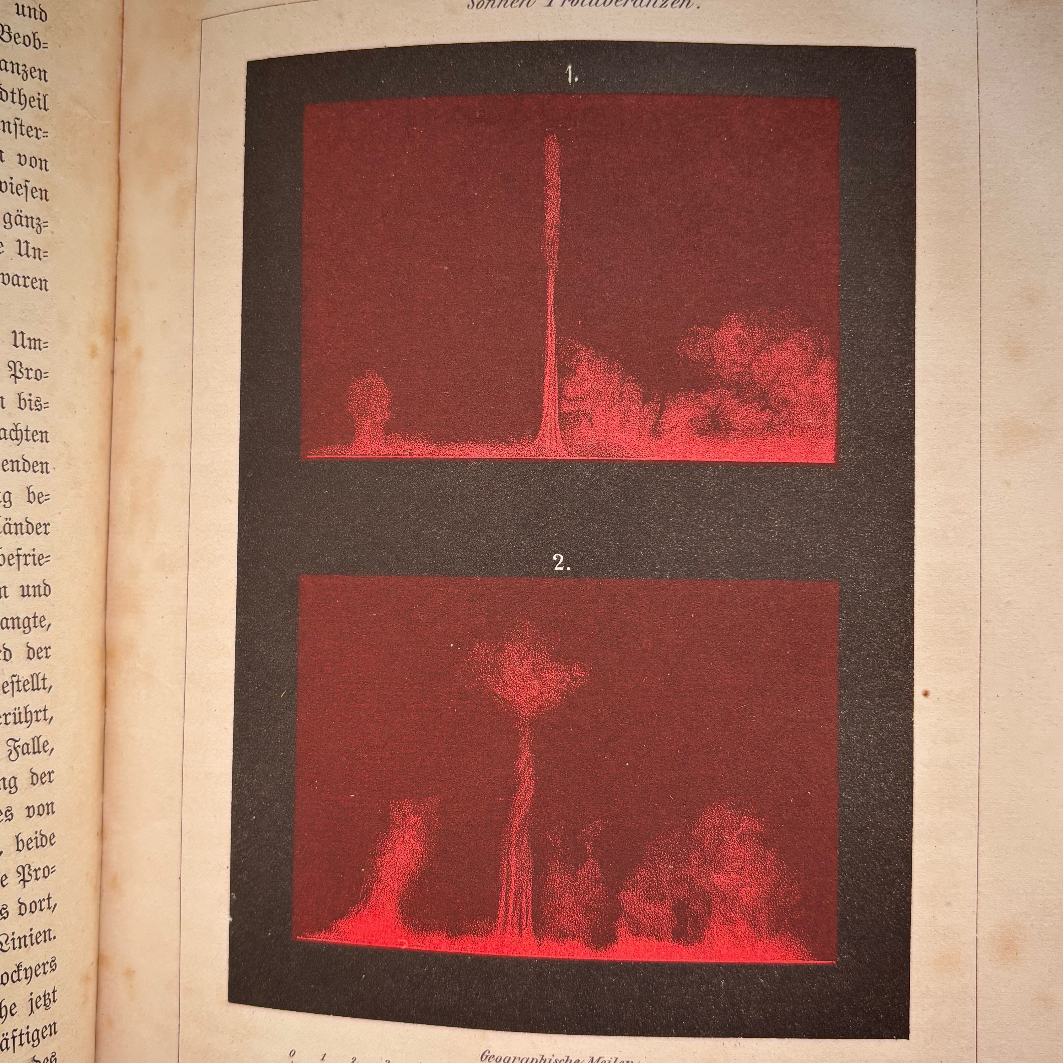 表紙を開くと幻想的なドナティ彗星のリトグラフが迎えてくれます。19世紀は彗星の世紀でしたが、1858年に現れたこの彗星は中でも最も美しい姿と賞賛されました。この本が出版されたライプチッヒは学術書籍の挿絵印刷でも定評のある町でしたが、この図版ももちろん当地で印刷されました。