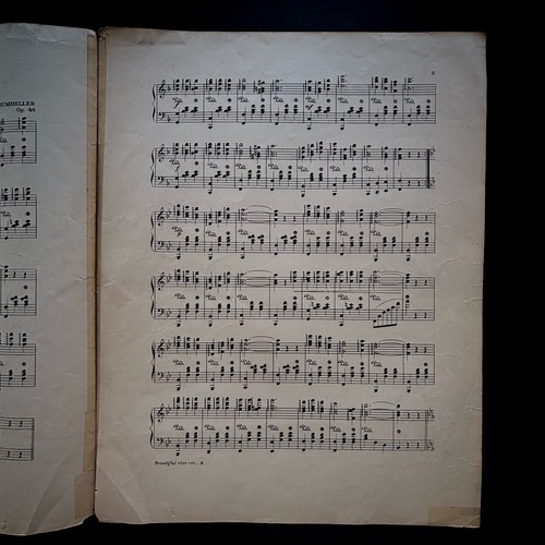 こちらは"Beautiful Star of Heaven"という曲の楽譜で、作曲者は"Louis A. Drumheller"、1905年にアメリカ、フィアデルフィアで出版されました。中は4ページのピアノ譜になっており「幻想曲」という副題が付いています。